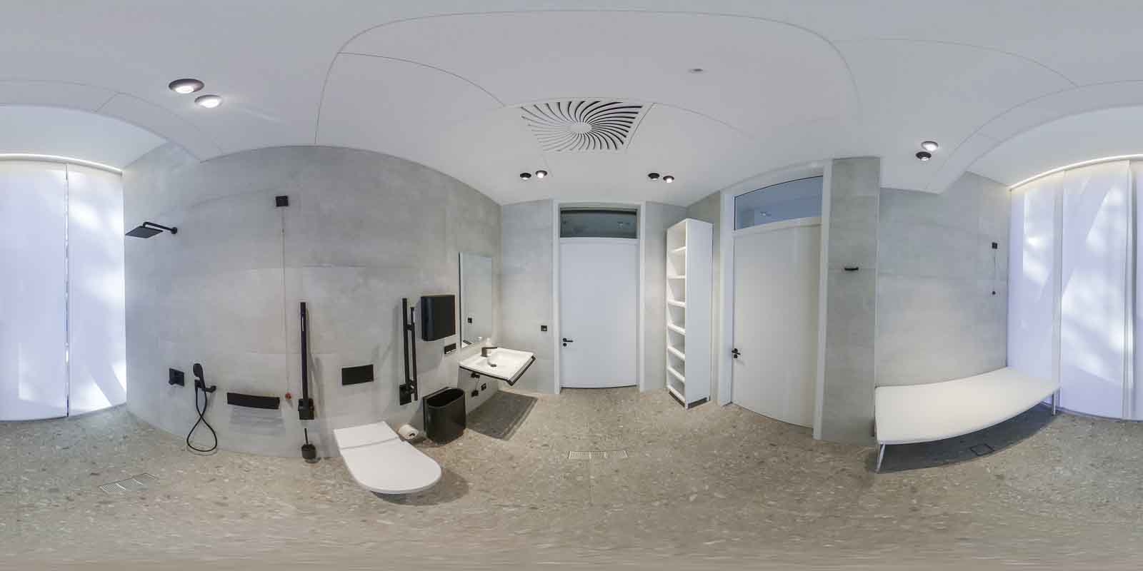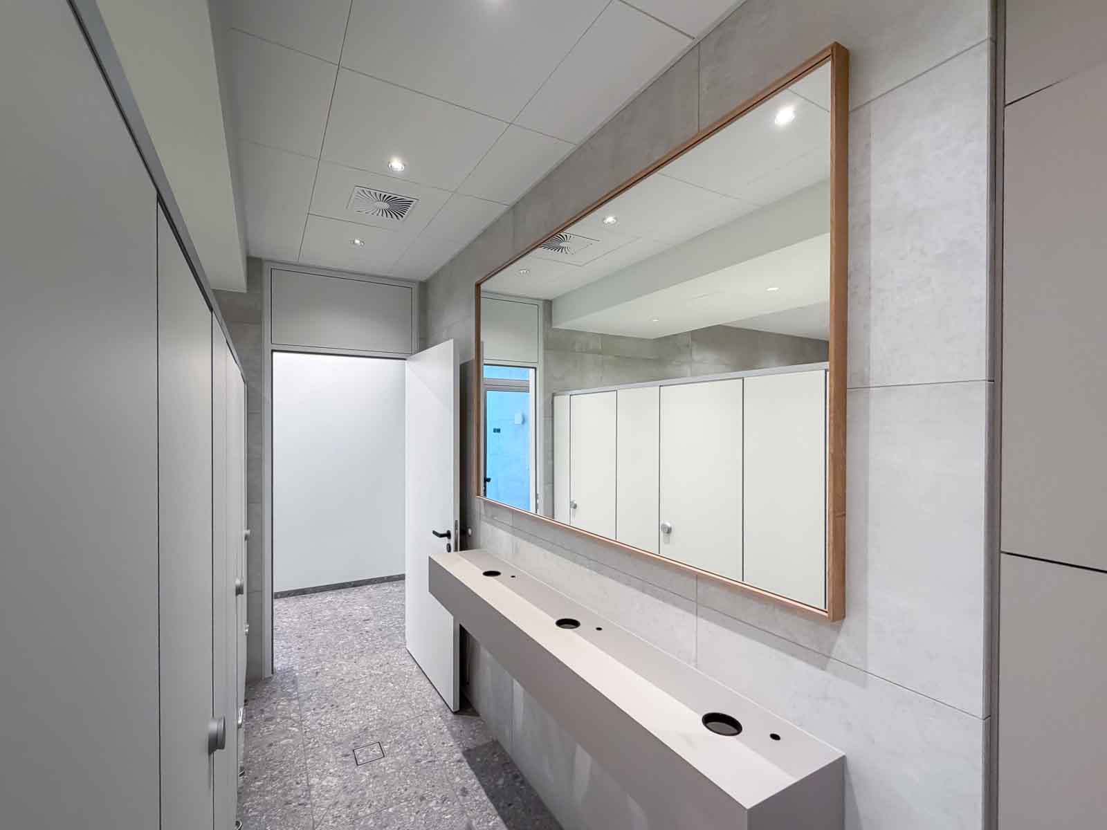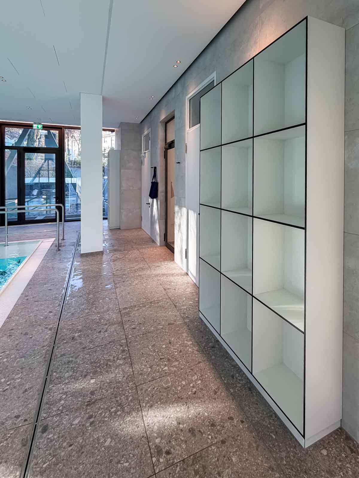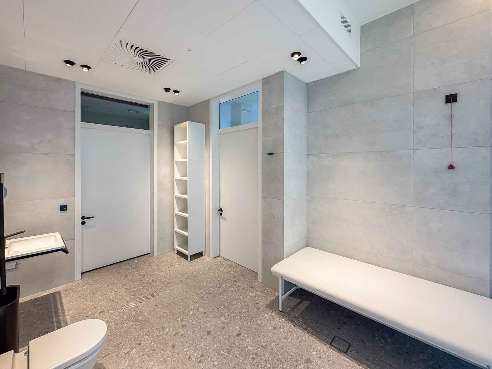 In den angrenzenden Nebenräumen des Solebades sind neben Umkleide- und Sanitärräumen weitere Therapieräume untergebracht, die den therapeutischen Betrieb funktional ergänzen und eine klare Trennung zwischen Wasser-, Ruhe- und Behandlungsbereichen ermöglichen.
