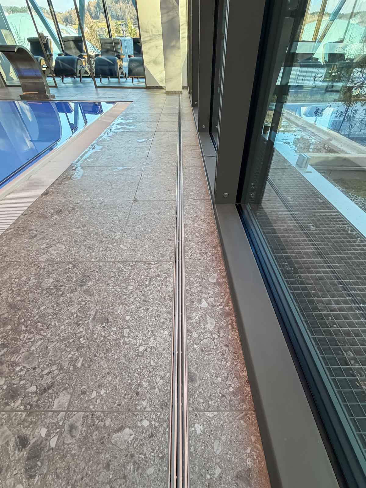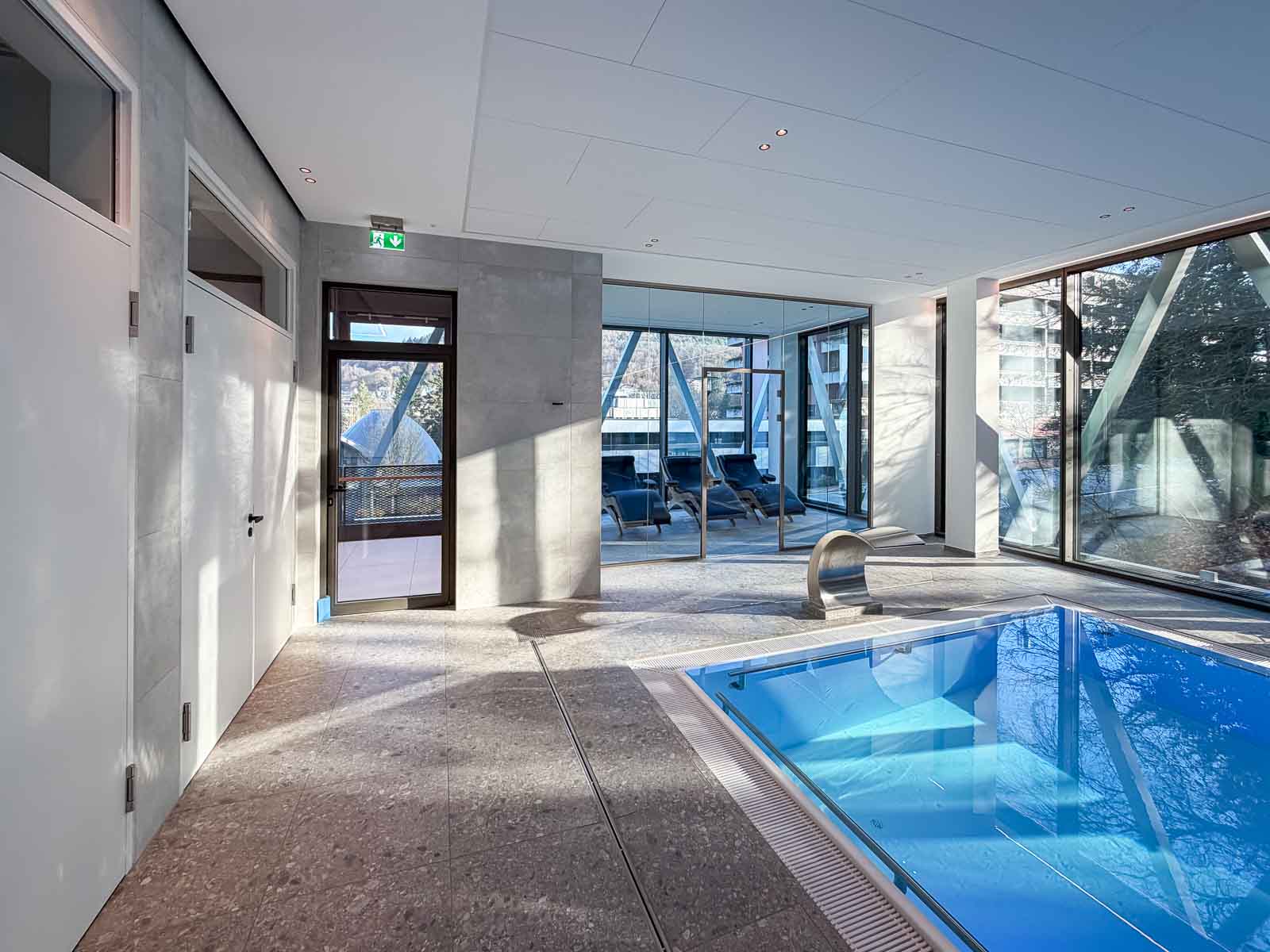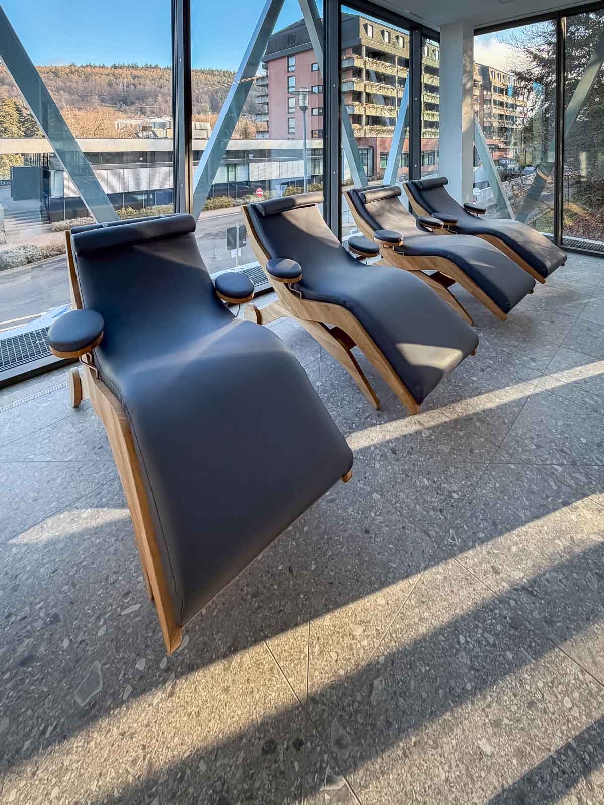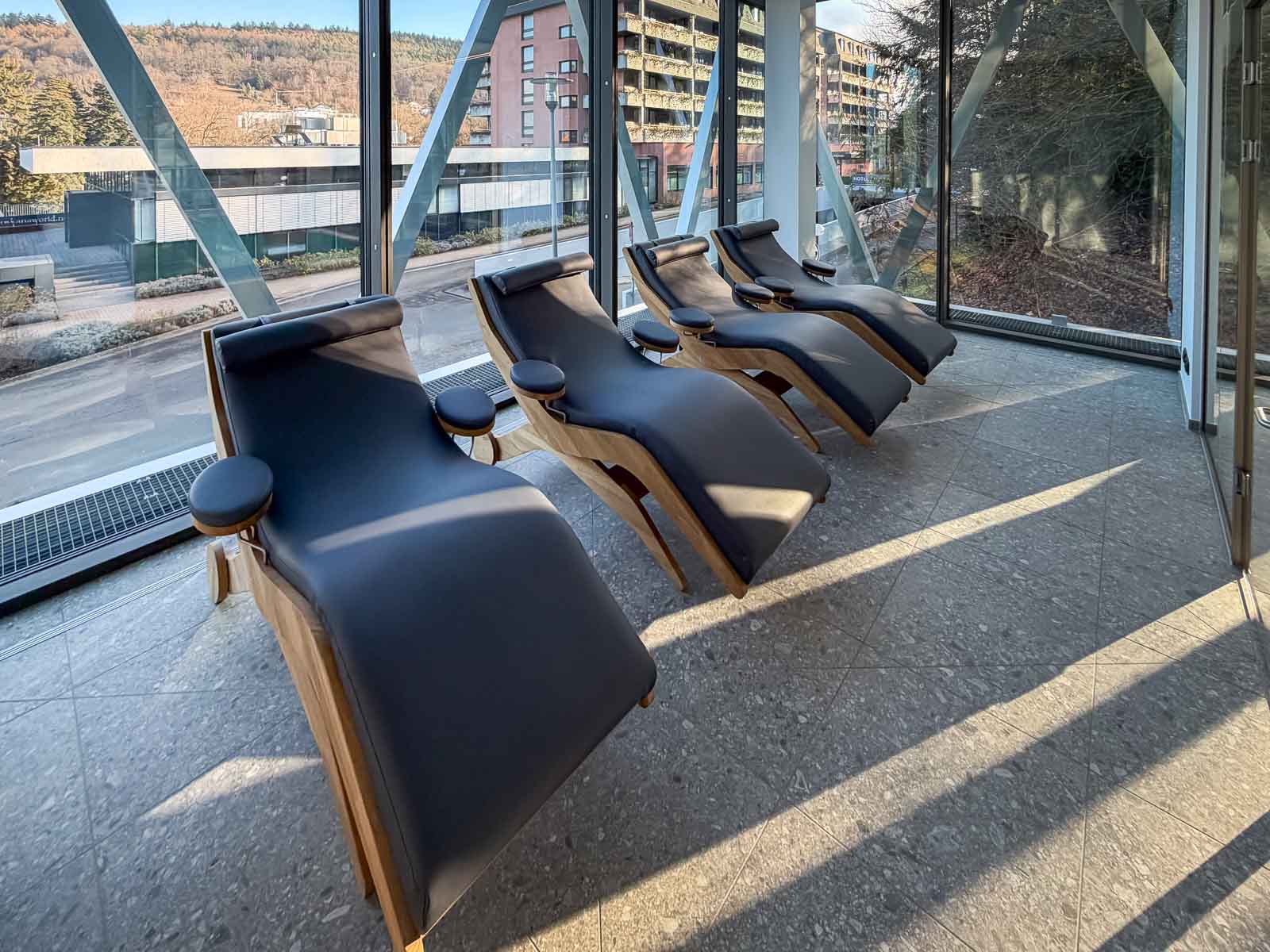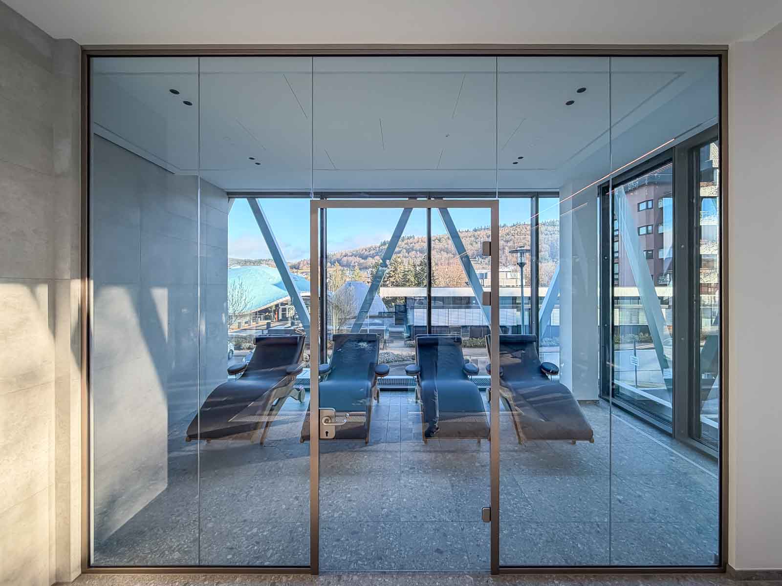An der Stirnseite des Raums befindet sich hinter einer modernen Glasabtrennung ein heller, lichtdurchfluteter Ruhebereich. Hochwertige Relaxliegen bieten den Anwendern Raum zur Erholung und Entspannung nach den Anwendungen. Auch hier bleibt der Bezug zur umgebenden Natur stets präsent.