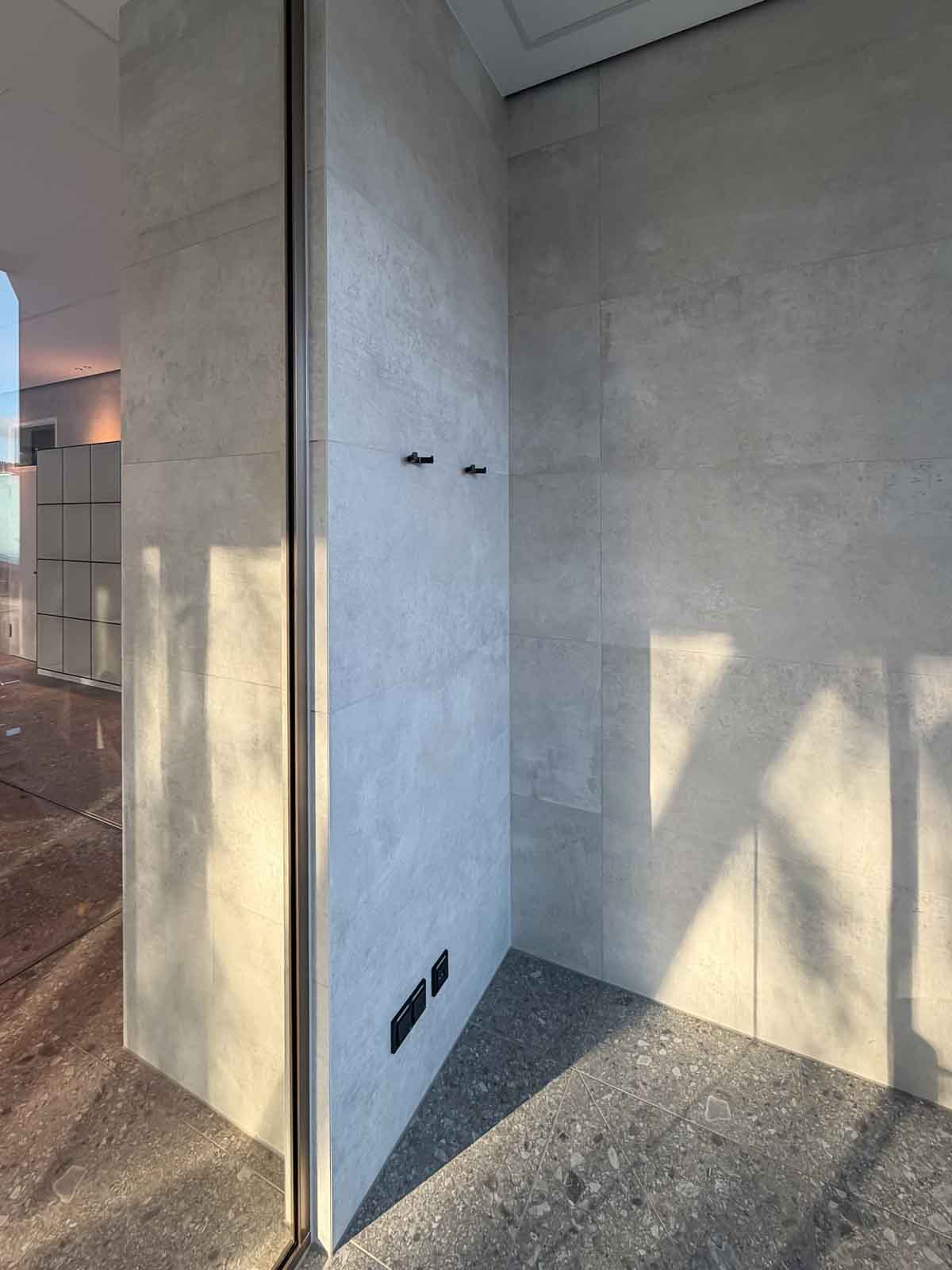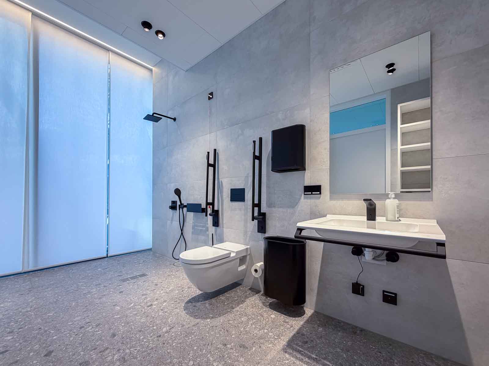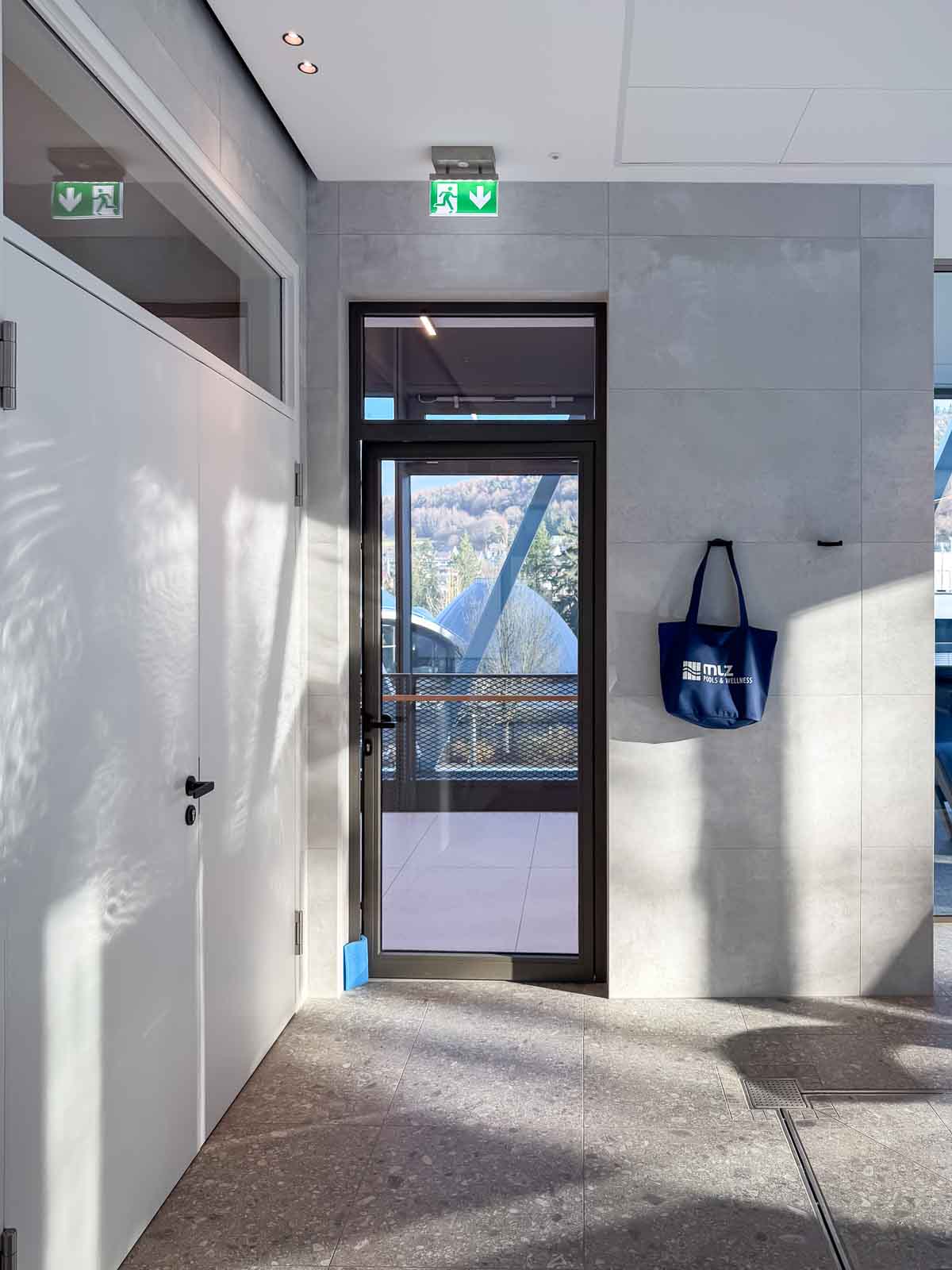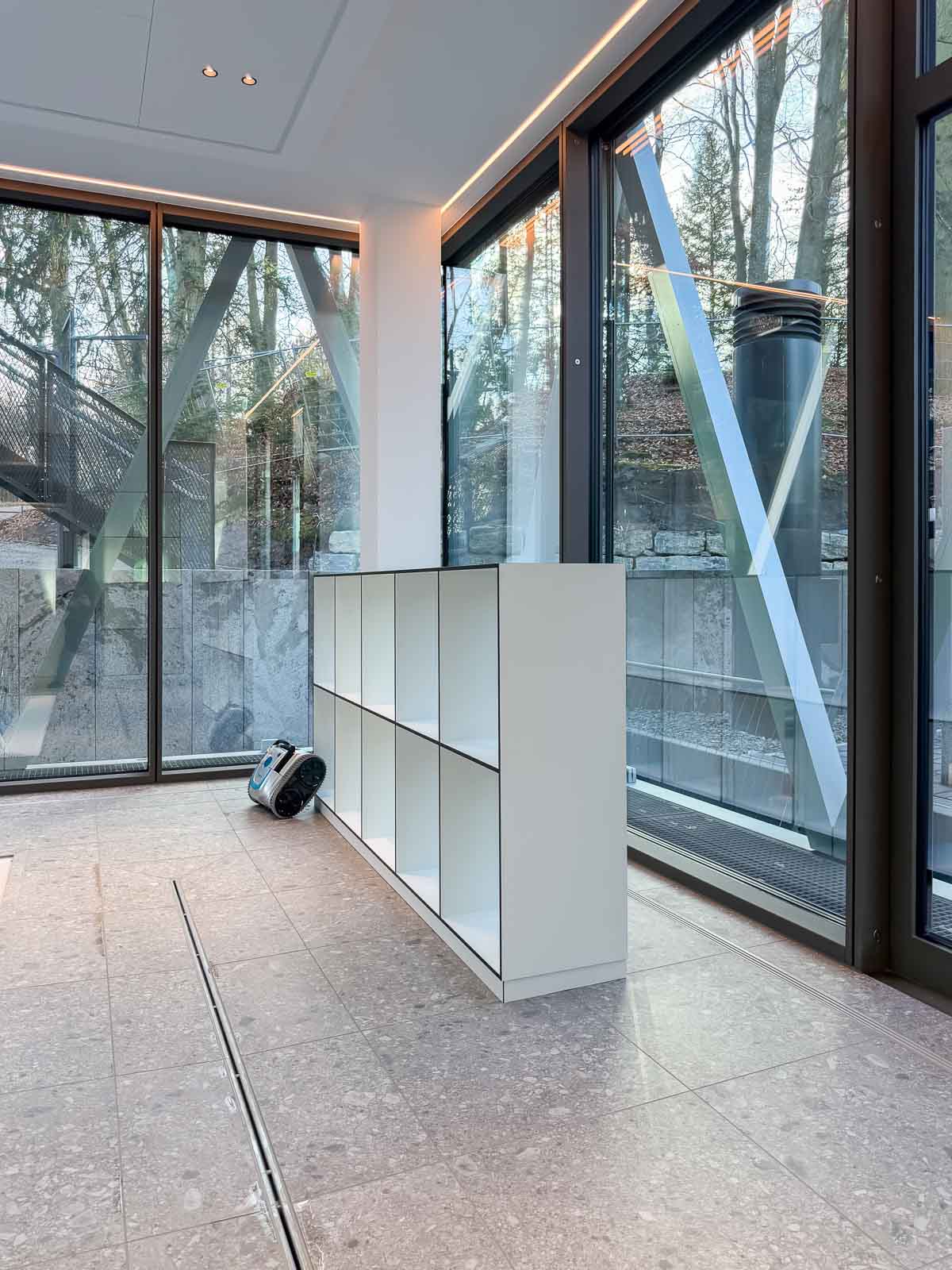 Der Raum präsentiert sich ruhig, hell und klar strukturiert. Großzügige Glasflächen lassen viel Tageslicht in den Raum und stellen eine unmittelbare Verbindung zur umgebenden Natur her. Das reduzierte architektonische Design schafft eine konzentrierte, angenehme Atmosphäre, die Therapieprozesse ebenso unterstützt wie Phasen der Regeneration.