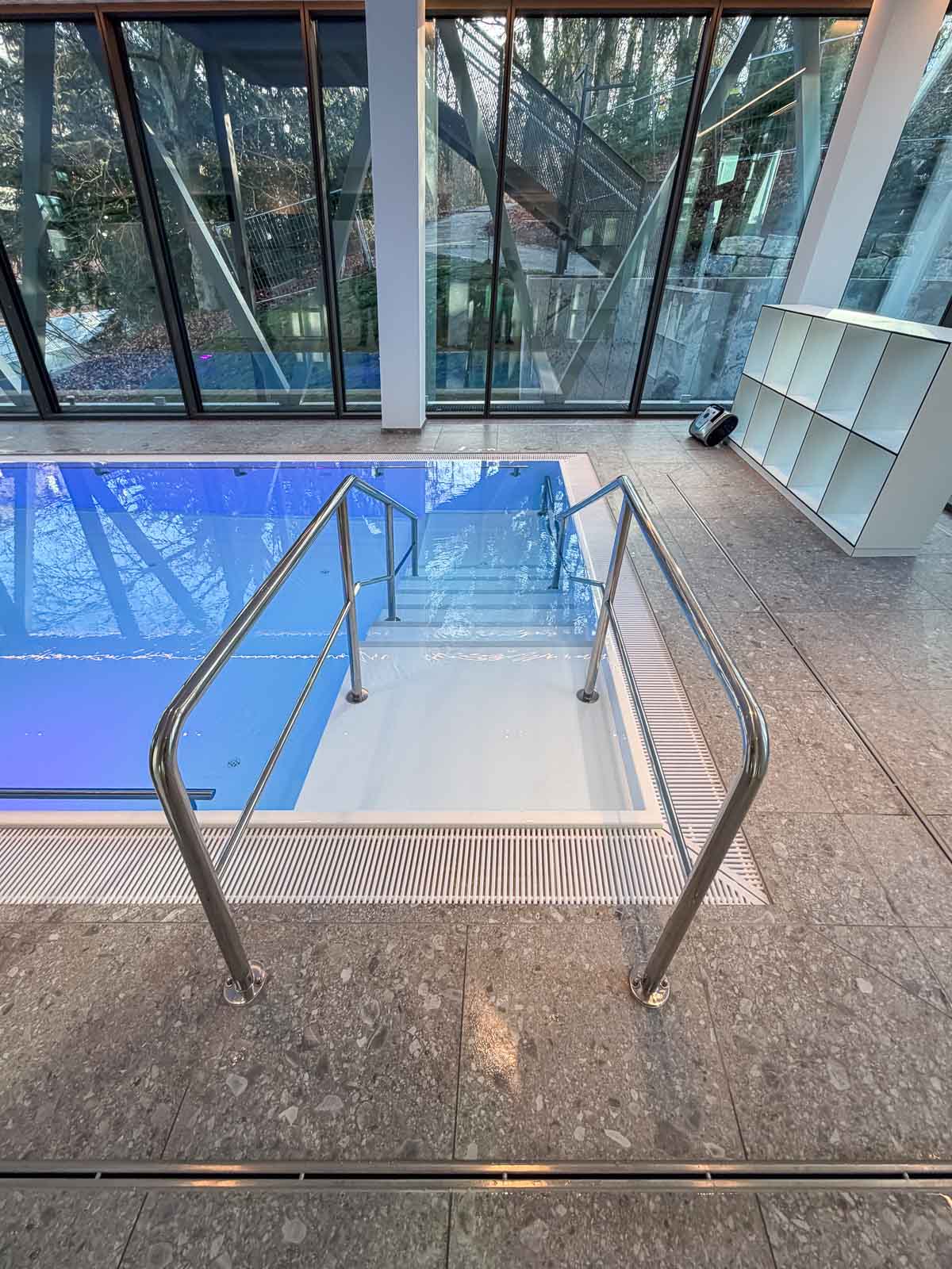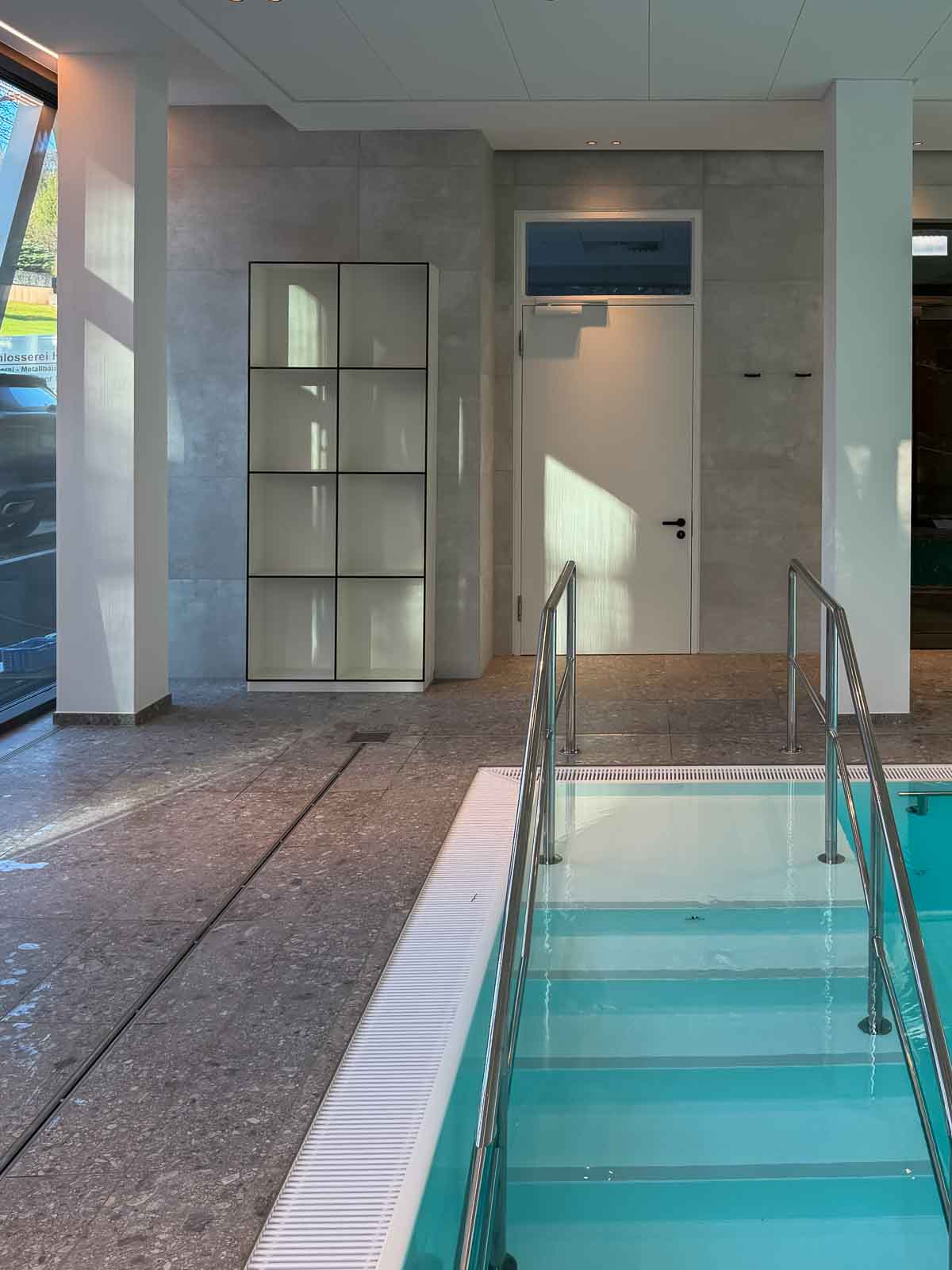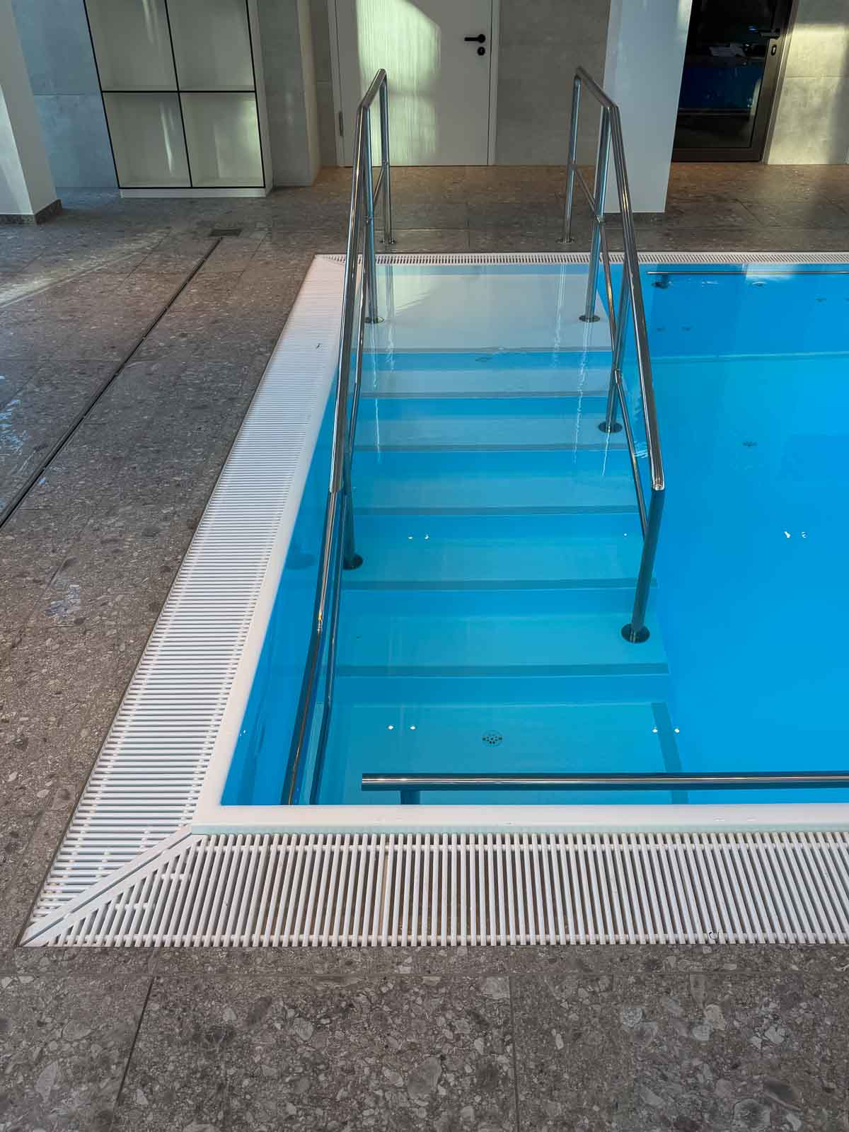 Das rechteckige Sole-Bewegungsbecken verfügt über einen Einstieg an der Stirnseite. Der Zugang erfolgt über ein Podest mit beidseitigen Handläufen und gewährleistet einen sicheren, barrierearmen Einstieg. Gegenüberliegend ist am Beckenrand ein Massage-Nackenschwall aus gebürstetem Edelstahl integriert, der zur gezielten Entspannung des Kopf-, Nacken- und Schulterbereichs beiträgt und die therapeutische Nutzung ergänzt.
