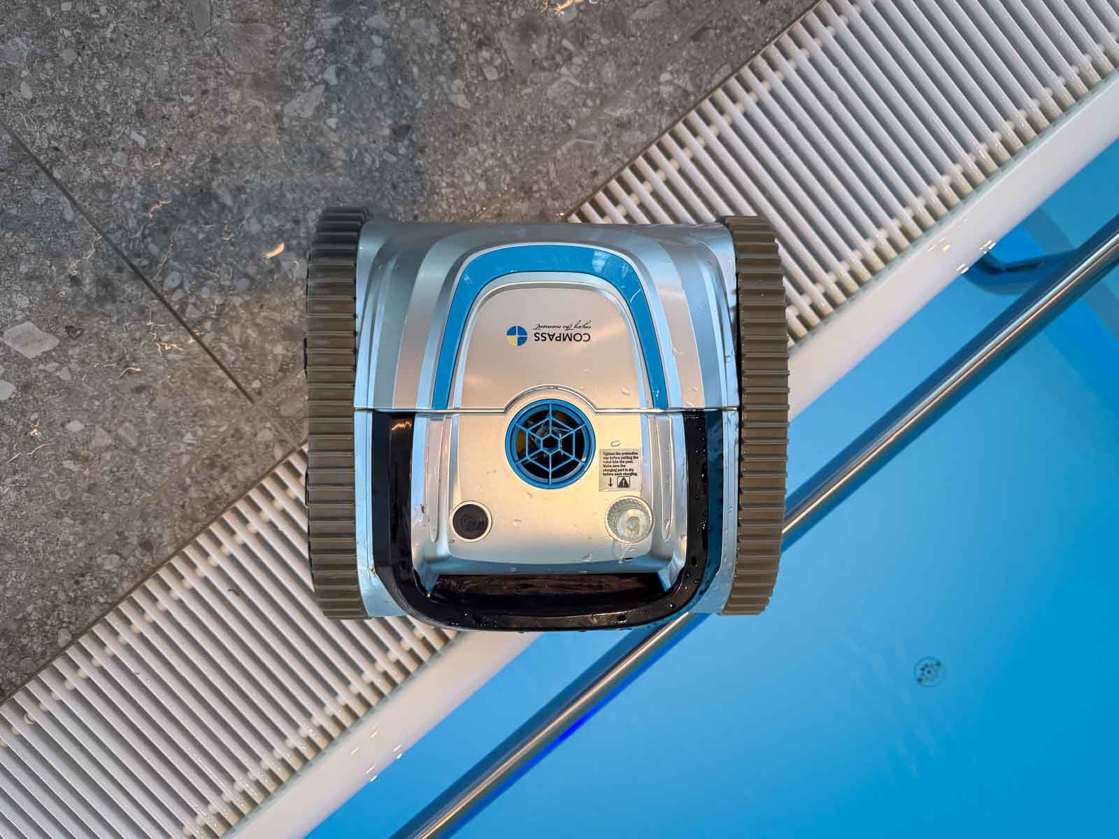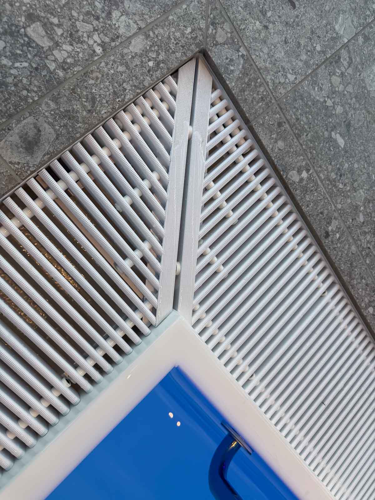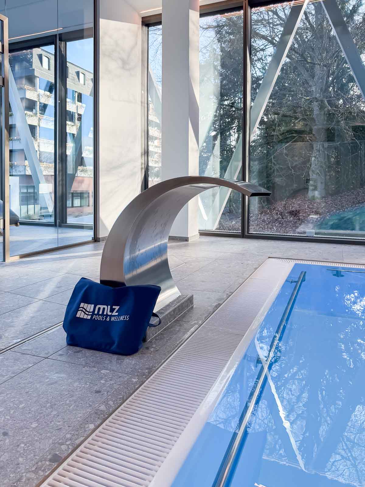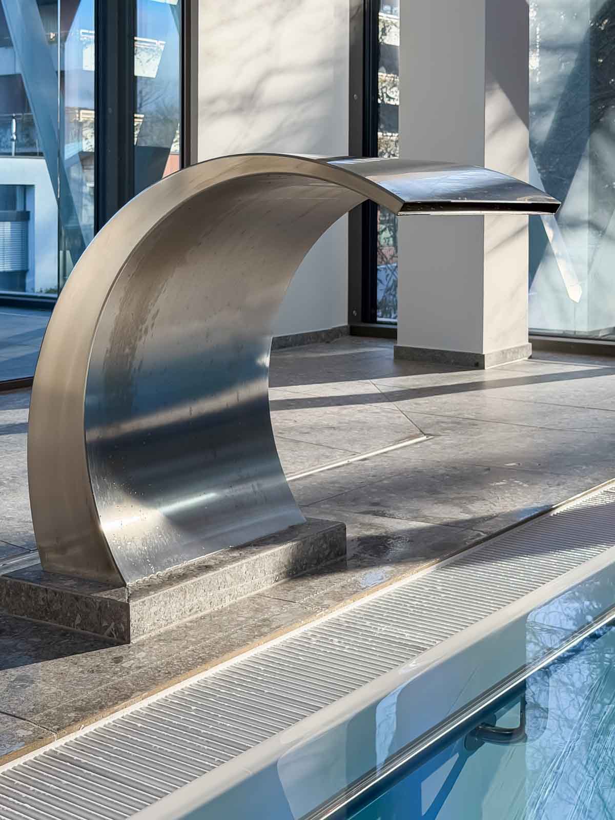 Das rechteckige Sole-Bewegungsbecken verfügt über einen Einstieg an der Stirnseite. Der Zugang erfolgt über ein Podest mit beidseitigen Handläufen und gewährleistet einen sicheren, barrierearmen Einstieg. Gegenüberliegend ist am Beckenrand ein Massage-Nackenschwall aus gebürstetem Edelstahl integriert, der zur gezielten Entspannung des Kopf-, Nacken- und Schulterbereichs beiträgt und die therapeutische Nutzung ergänzt.