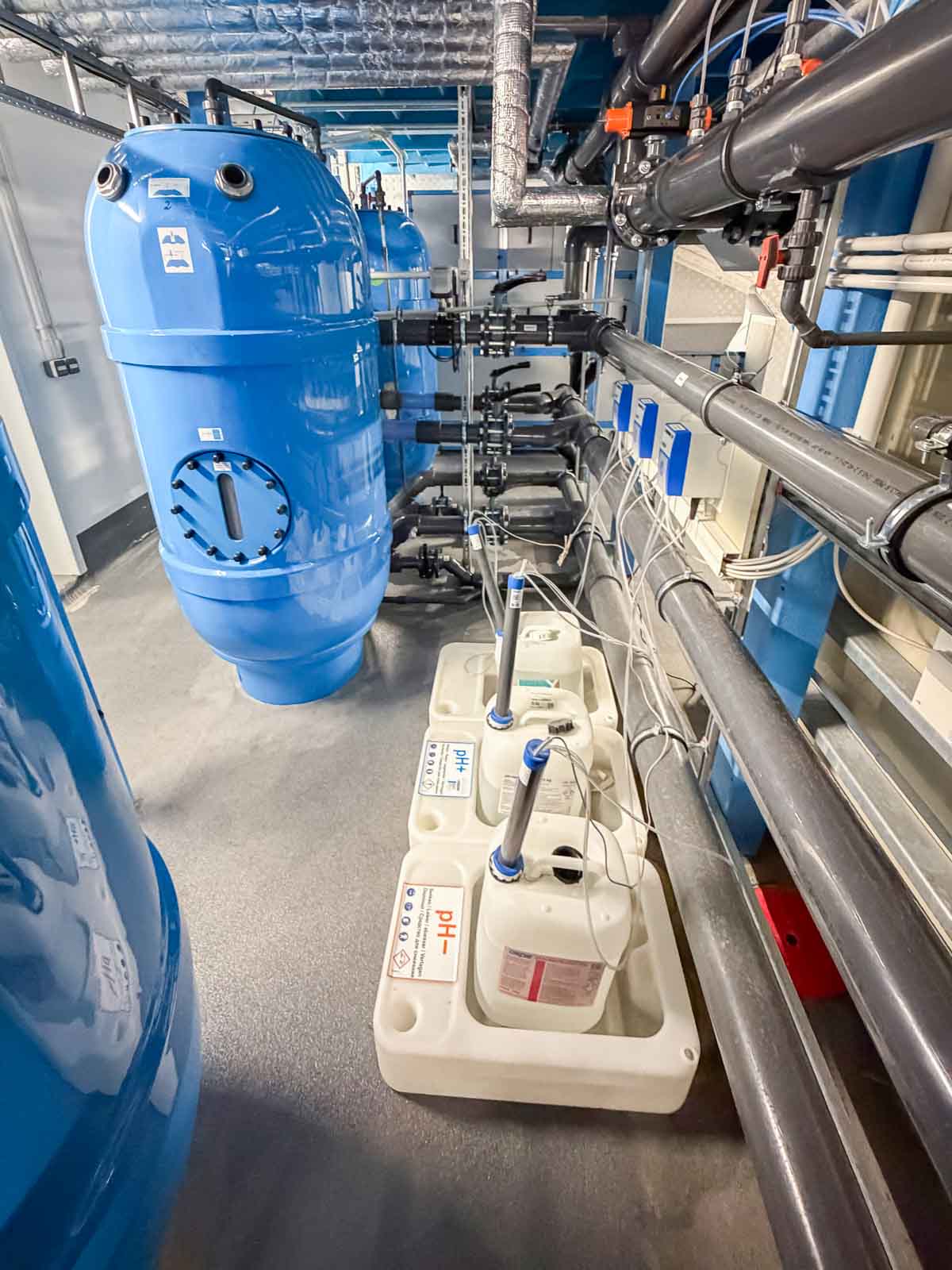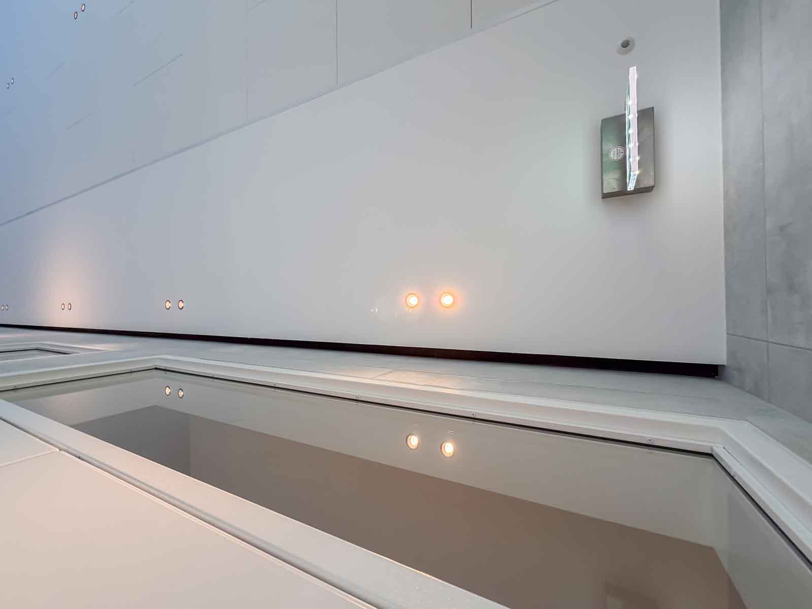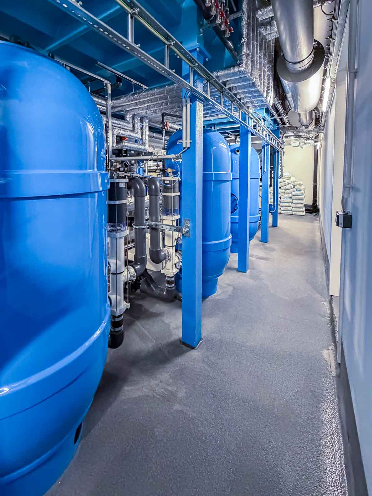 Besondere Aufmerksamkeit galt der materialgerechten Ausführung aller mit Sole in Berührung kommenden Komponenten sowie der exakten Regelung der Wasserparameter. Die Anlagentechnik sorgt für eine gleichmäßige Wasserführung, konstante Temperaturverhältnisse und eine dauerhaft hohe Wasserqualität.