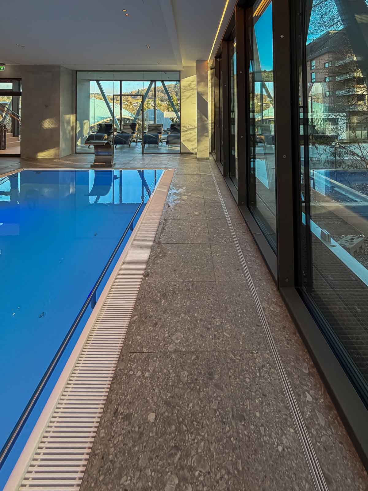 Das realisierte Sole-Bewegungsbecken bildet den funktionalen Mittelpunkt der Anlage. Die Kombination aus temperiertem Wasser, klarer Beckengeometrie und natürlicher Sole aus der Philippsquelle schafft optimale Rahmenbedingungen für gelenkschonende Bewegungsabläufe und eine sichere therapeutische Anwendung.