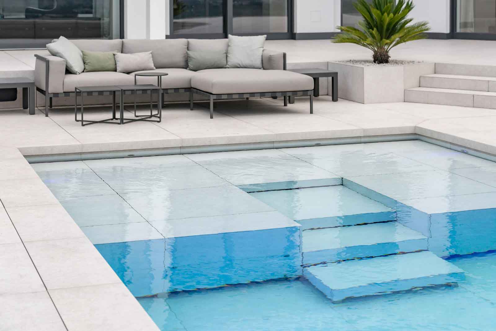 Eine Flachwasserzone verwandelt den Pool in einen vielseitigen Erlebnisraum. Sie verbindet Sicherheit, Komfort und Design – und macht den Pool für alle Generationen attraktiv.