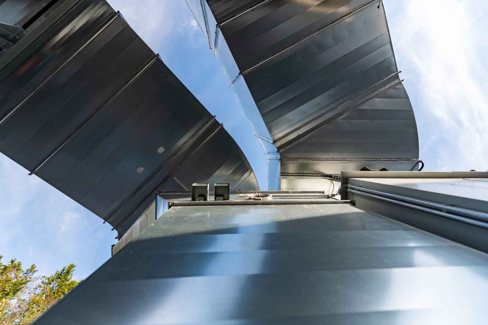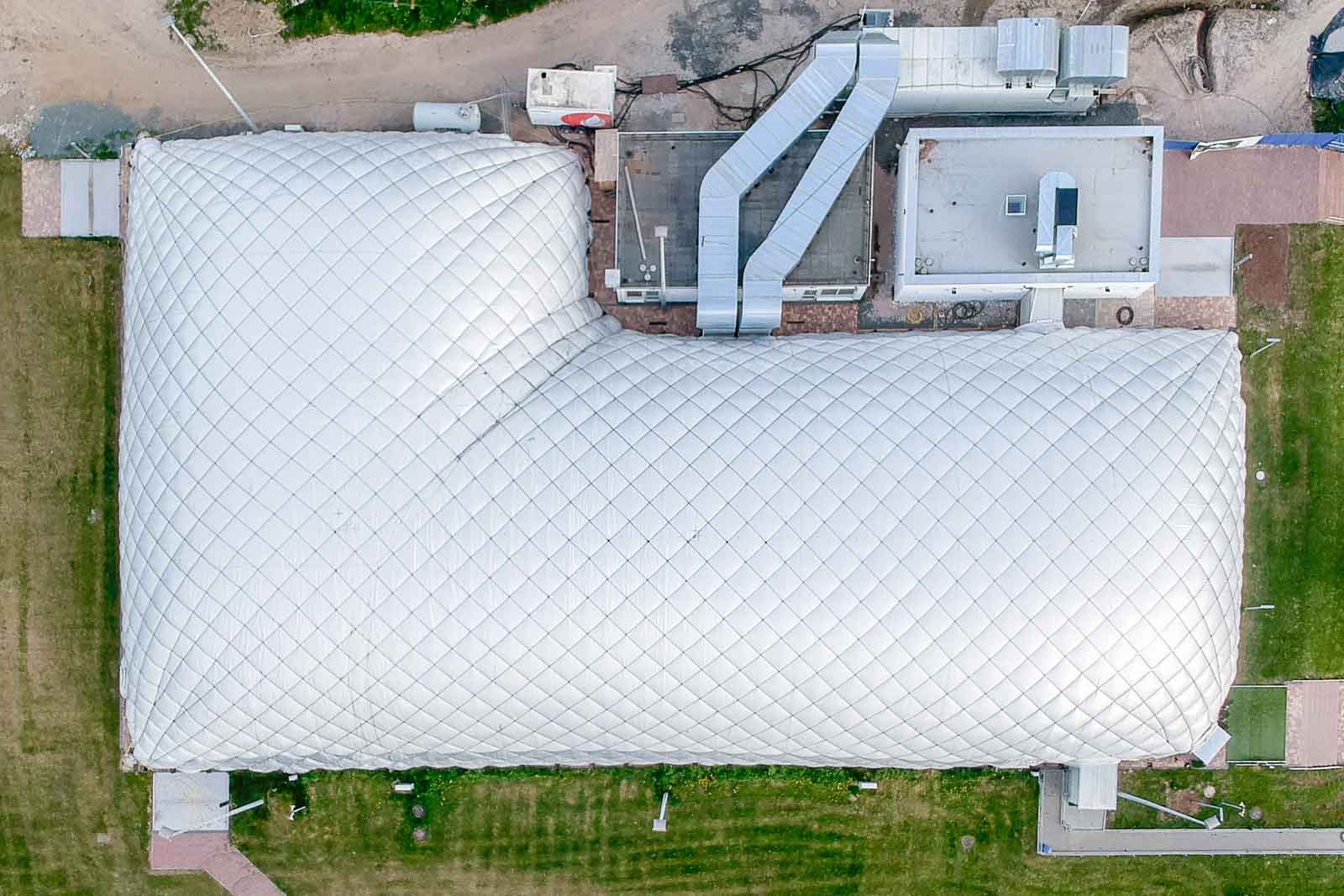 Kernkomponente ist das Lüftungs- und Druckhaltesystem, das den benötigten Überdruck konstant aufrechterhält. Die Anlage übernimmt sowohl die Zuluftförderung als auch die Regelung der Druckverhältnisse in Abhängigkeit von äußeren Einflüssen wie Windlast, Temperatur und Nutzungsbetrieb.