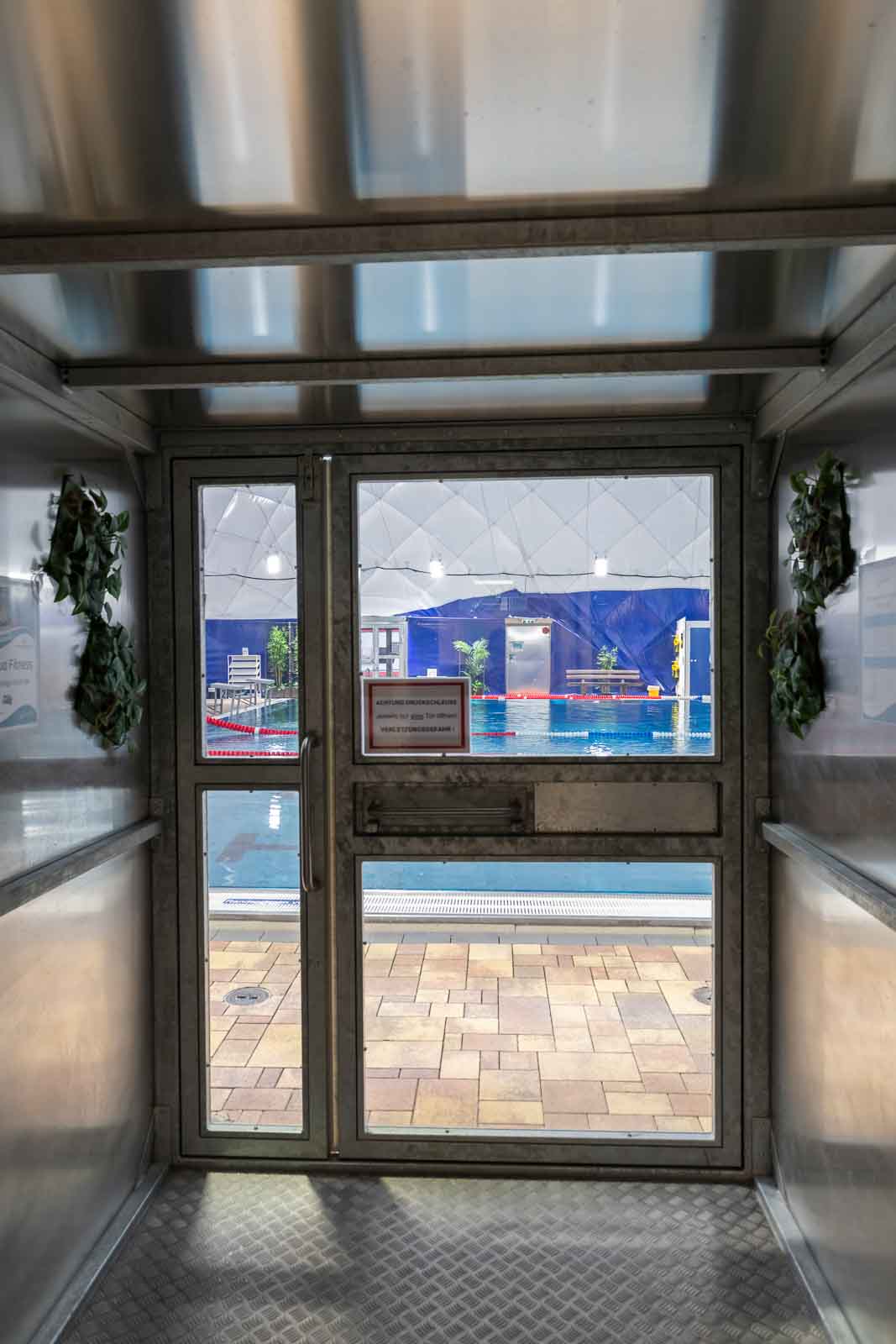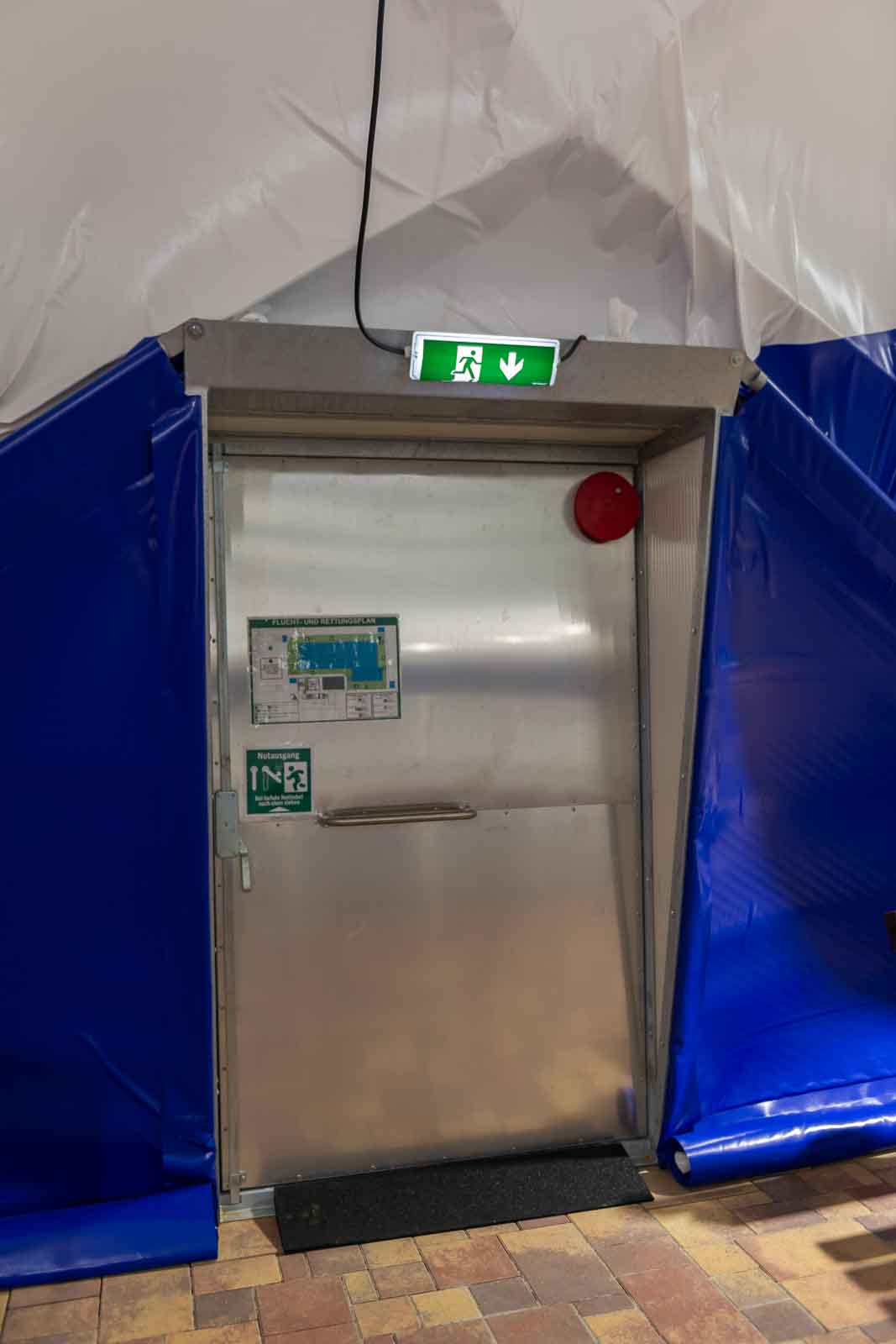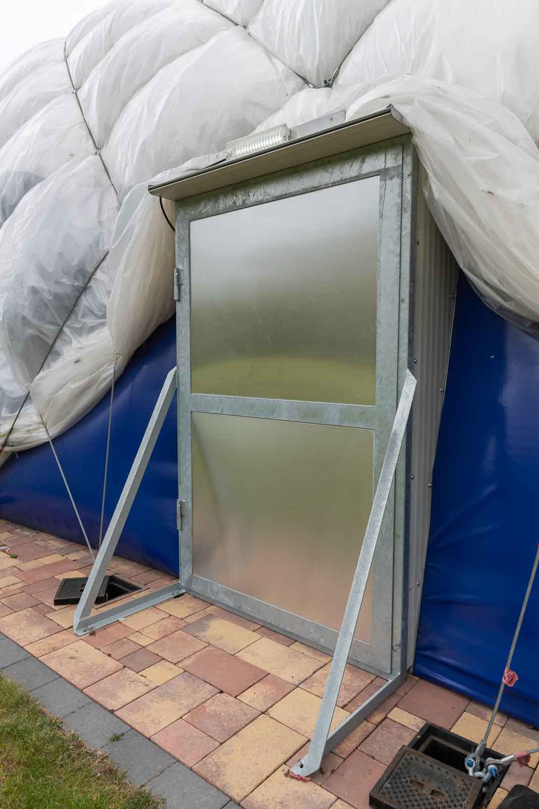 Der Zutritt erfolgt über Druckschleusen, um Druckstabilität und Betriebssicherheit zu gewährleisten. Türen sind mit Druckentlastungselementen bzw. Druckklappen ausgestattet, damit sich diese kontrolliert und sicher gegen den Halleninnendruck öffnen lassen.